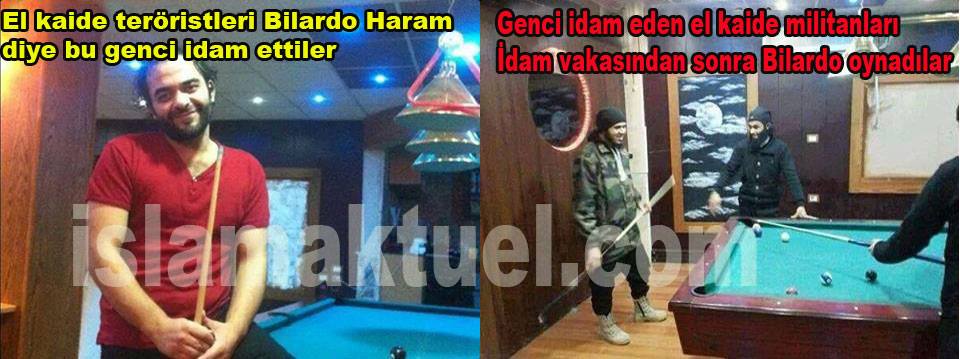 Suriye’nin Rakka kentinde el kaide teröristleri bilardo kafe sahibi Muhammed Hayr Mahfal isimli genci bilardo haram ve küfr diyerek idam ettiler. Sonra el kaide teröristleri katlettikleri Muhammed Hayr Mahfal’ın bilardo Salonunda bilardo oynamaya başladılar. Suriye de teröristler için insan katletmek bu kadar basit.