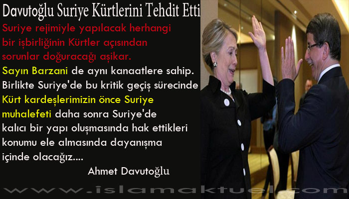 Bakan Davutoğlunun Yaptığı bu değerlendirmeden sonra,Suriye’nin Kürt bölgesinde ki durumun net bir şekilde anlaşılacağı kanaatindeyiz.Zira Türkiye Dış işleri bakanının Belirttiğine göre;Kendileri ve Irak’ın Bölgesel Kürt Yönetiminin Ortak görüşü olarak,Suriye Kürtlerinin Muhalifler tarafında Olması istenmektedir.PYD adı altında faaliyet gösteren ve nevzuhur,alelacele kurulan Fason örgütün ve lideri Salih Müslim’in de Türkiye ziyaretinde MİT Müsteşarı hakan fidan ile görüşmesi sonrası yaptığı açıklama ile Türkiye devletine bağlılığını bildirmesi,O’nun da Türkiye-Barzani ekseninde hareket ettiğini göstermiştir.