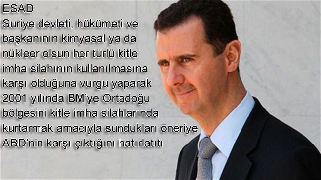 Suriye devleti, hükümeti ve başkanının kimyasal ya da nükleer olsun her türlü kitle imha silahının kullanılmasına karşı olduğuna vurgu yaparak 2001 yılında BM’ye Ortadoğu bölgesini kitle imha silahlarında kurtarmak amacıyla sundukları öneriye ABD’nin karşı geldiğini hatırlatırken “Suriye’nin politikası ve kanaatleri budur” dedi.