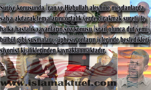 Suriye konusunda İran ve Hizbullah aleyhine meydanlarda salya akıtarak,tenyalarını ortalık yerde bırakmak sureti ile halka hastalık yayanların,söz konusu İsrail olunca dut yemiş bülbül gibi susmaları,şüphesiz onların içlerinde besledikleri siyonist kişiliklerinden kaynaklanmaktadır.