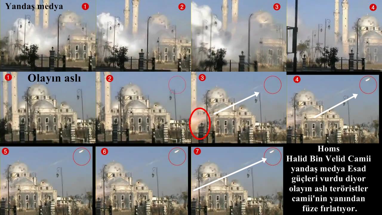 Teröristler ve onların medyaları ile Türkiye’deki yandaş medya günlerdir Homs Halid Bin Velid camii Esad güçlerince vuruldu diyor ve duman içerisinde kısa bir vurulma anı diye video gösteriyor.