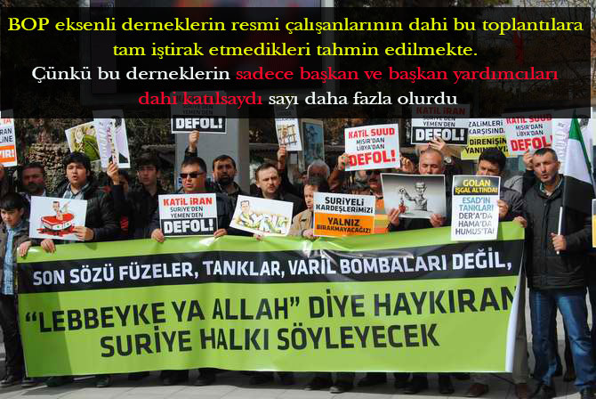 Halk desteğinden tamamen yoksun, bu zavallı zevatın aslında var olan üç-beş kişiyi dahi toplayamayacağı açık iken,gösterilere katılanların yine kendi vakıf,Dernek çalışanları olduğu kanaati hasıl olmaktadır, BOP eksenli derneklerin resmi çalışanlarının dahi bu toplantılara tam iştirak etmedikleri tahmin edilmekte. Çünkü bu derneklerin sadece başkan ve başkan yardımcıları dahi katılsaydı sayı daha fazla olurdu…..