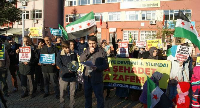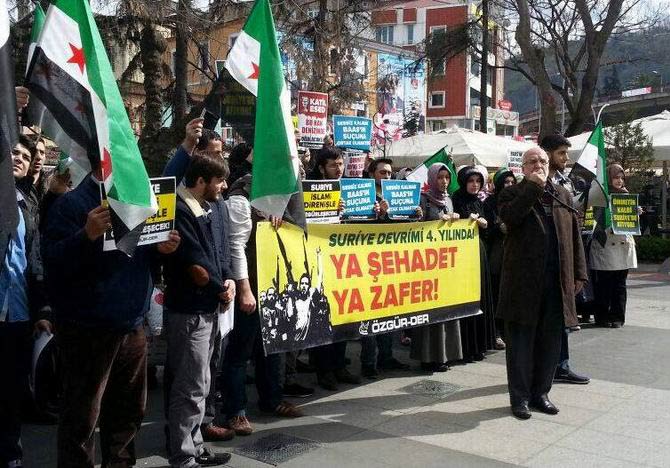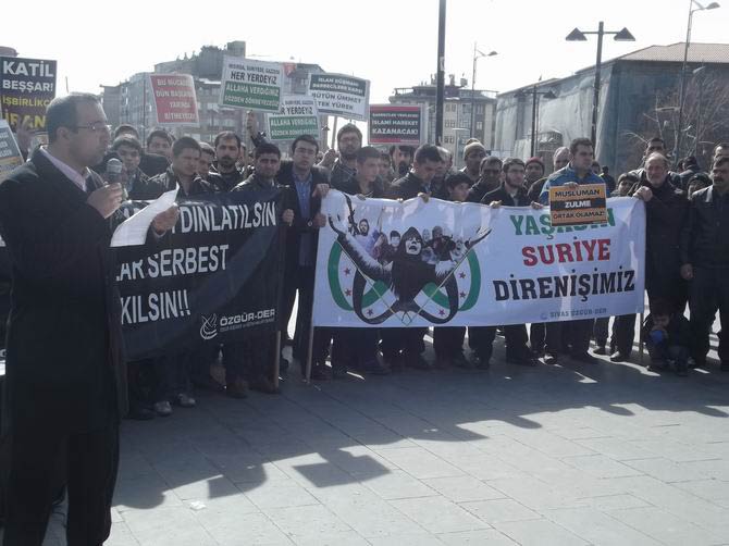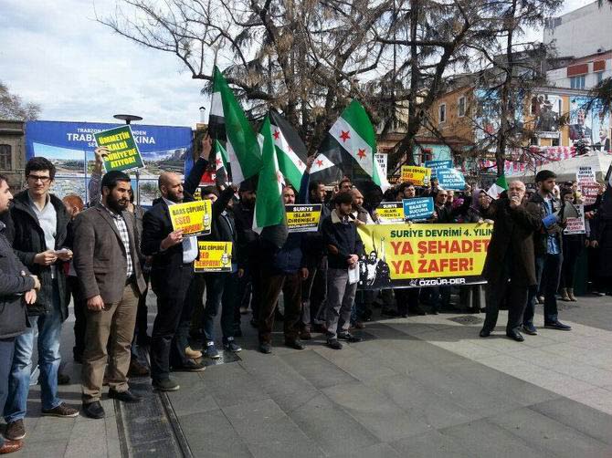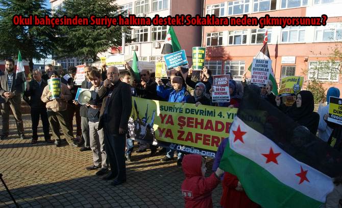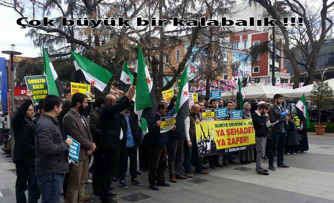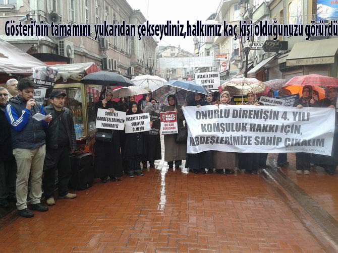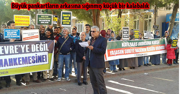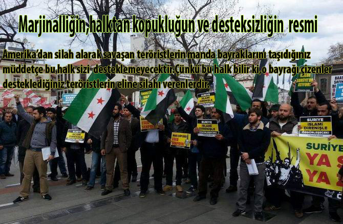 En baştan beri Suriye Direnişine destek adına gösteri yapan bu marjinal gruplar,hazırladıkları büyük pankartların arkasına sığınarak ve topladıkları üç beş kişiyi tam karşıdan görüntüleyerek kalabalık izlenimi vermeye çalışmış,bu şekilde sanki ülkemizde muhalif teröre destek verildiği izlenimi oluşturulmak istenmiştir.Destek gösterileri denen gösteri resimleri incelendiğinde durumun tam da anlatılan gibi olduğu,yani gösterilere sayılı ve marjinal grupların bir kaç adamı dışında katılımın olmadığı görülecektir.