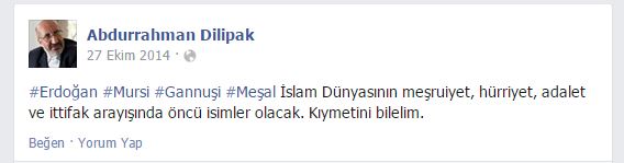 Abdurrahman Dilipak:Erdoğan, Mursi, Gannuşi, Meşal İslam Dünyasının meşruiyet, hürriyet, adalet ve ittifak arayışında öncü isimler olacak. Kıymetini bilelim.