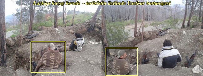Lazkiye kuzey kırsalı Türkiye sınırına yakın olan bölgedeki teröristin üzerinde YURTKUR battaniyesi var.