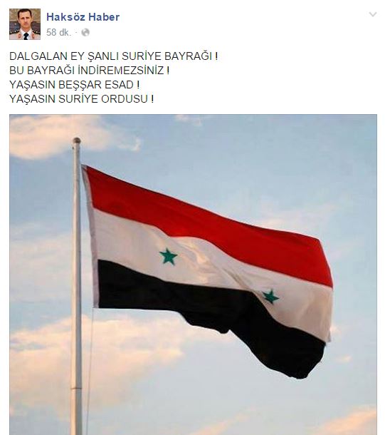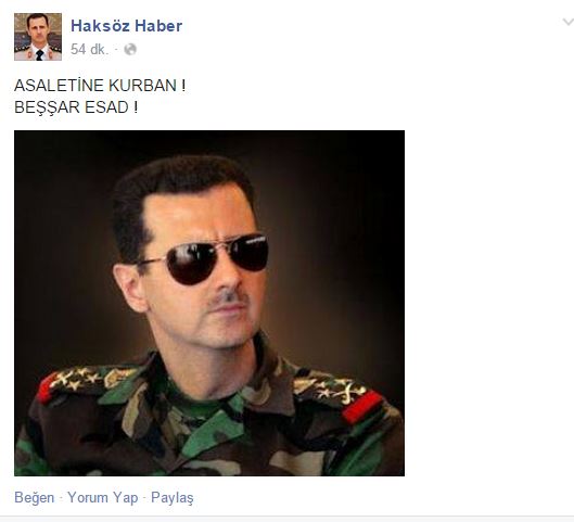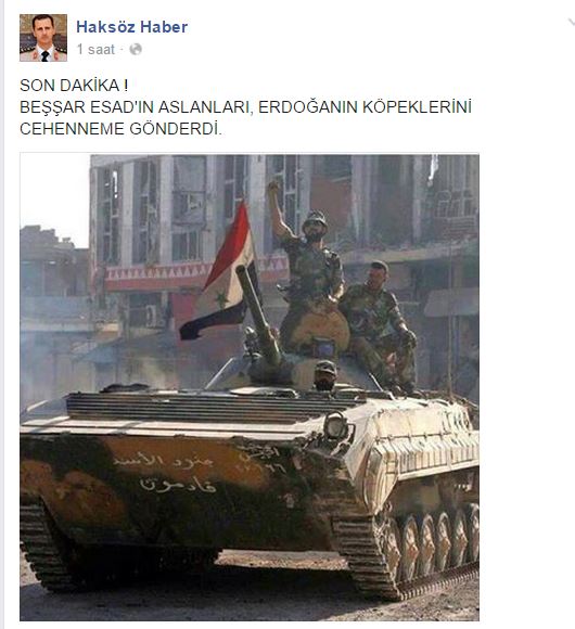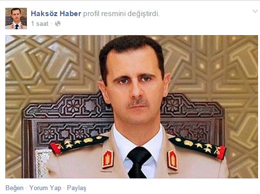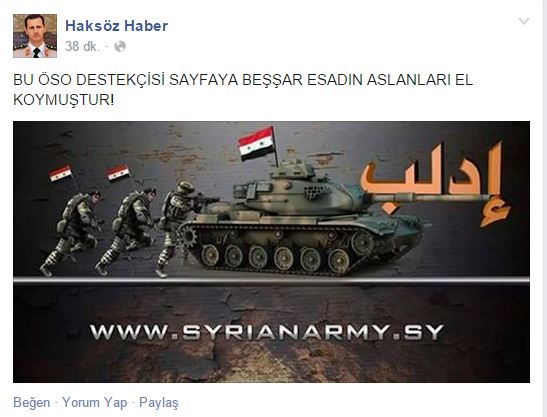 Sayfanın profil ve kapak fotoğraflarını değiştiren grup, Sayfa duvarında “BU ÖSO DESTEKÇİSİ SAYFAYA BEŞŞAR ESADIN ASLANLARI EL KOYMUŞTUR!” şeklinde Beşşar Esad’ın fotoğrafıyla birlikte bir açıklama yayınladı.