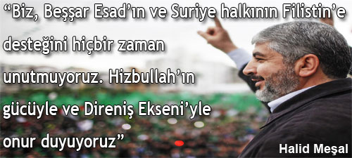 Suriye’nin Filistin’e yardım konusundaki değerli rolünü takdirle andıklarını belirten Meşal, direnişin Filistin halkının haklarını alabilmesinin en önemli yolu olduğunu belirtti ve Filistin’de sağlanan ulusal uzlaşmanın önemine dikkat çekti.