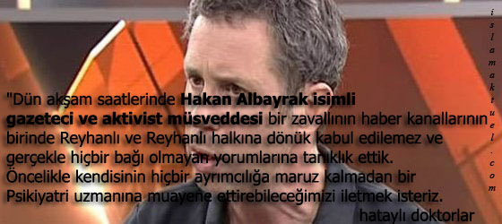 Reyhanlı’da yaşanan katliamın ardından Hakan Albayrak adlı “gazetecinin” Reyhanlı halkını neonazi ilan etmesi ve “Alevi doktorlar Sünni Suriyeli sığınmacıları tedavi etmiyorlar” iddiasına Hataylı doktorlardan sert yanıt verdi.