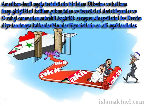 -Akit el kaide ve ÖSO teröristlerine açık destek vermektedir, Bu iki grup ise suriye’de kafa kestiklerini ve cinayetlerini gizleme gereği bile duymamaktadır,Akit bunlarla aynı safta olduğuna göre akit ne olmaktadır ?