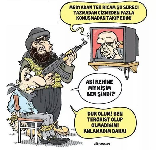 El kaide bağlantılı terör örgütü Nusra cephesinin,Türkiye tarafından önce terör örgütü listesine alınması ve akabinde tekrar listeden çıkarılması ve Musul olayı hakkındaki basın yasakları karikatüristler tarafından böyle görüldü.