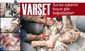 Suriye’de Esad’a karşı savaşan isyancılar, yine kan donduran bir vahşete imza attı. El Kaide bağlantılı “Irak ve Suriye İslam Devleti” adlı örgütün canileri, esir aldıkları bir Suriyeli askeri koyun gibi kestiler. 31 Ağustos’ta Halep yakınlarındaki Kefergan’da meydana gelen olayın fotoğrafları Time dergisinde yayımlandı. Fotoğrafları çeken ancak adının açıklanmasını istemeyen şahıs, “o gün Kefergan’da başı kesilen son 4 kişiyi görüntülediğini” söyledi.