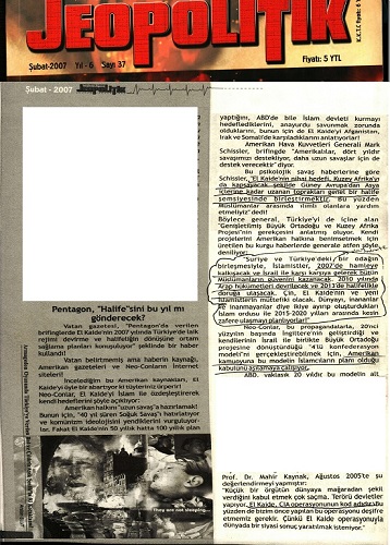 Türkiye’de geçmiş tarihlerde yayınlanan bir dergi: jeopolitik. şubat 2007’de yayınlanan dergide ilginç bilgiler mevcut. Henüz gerçekleşmemiş olayları tarih de vererek önceden haber veren bir yönü var bu derginin.
