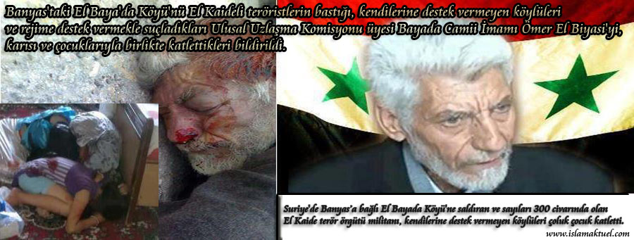 Banyas’taki El Baya’da Köyü’nü El Kaideli teröristlerin bastığı, kendilerine destek vermeyen köylüleri ve rejime destek vermekle suçladıkları Ulusal Uzlaşma Komisyonu üyesi Bayada Camii İmamı Ömer El Biyasi’yi, karısı ve çocuklarıyla birlikte katlettikleri bildirildi.