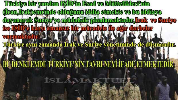 Şöyle ki, Türkiye bir yandan IŞİD’in Esad ve Müttefikleri’nin (İran,Irak,Hizbullah)emrinde olduğunu iddia etmekte ve bu iddiaya dayanarak Suriye’ye müdahale planlamaktadır,Irak ise IŞİD’e karşı amansız bir mücadele ile ağır darbeler vurmaktadır,Aynı zaman da Türkiye yönetimi Irak yönetimine de düşmandır ve hatta Irak’lı idamlık Tarık Haşimi’yi İnterpol kararına rağmen saklamaktadır.Bu denklemde IŞİD’in Türkiye’ye düşman olduğunu ve Türkiye’nin gerçekten bu Örgütü düşman bildiğini iddia etmek ne kadar doğrudur ?