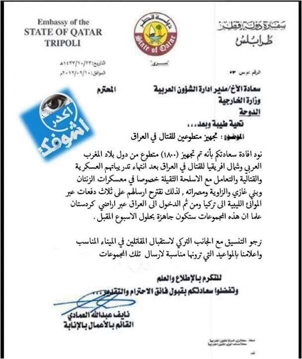 Bir Arap forum sitesinde yayımlanan ve Katar’ın Trablus büyükelçiliğine ait olduğu iddia edilen belgede Libya’dan gönderilen 1800 teröristin Türkiye üzerinden Irak’a gönderilmesi için Türkiye ile koordinasyon kurulması isteniyor.