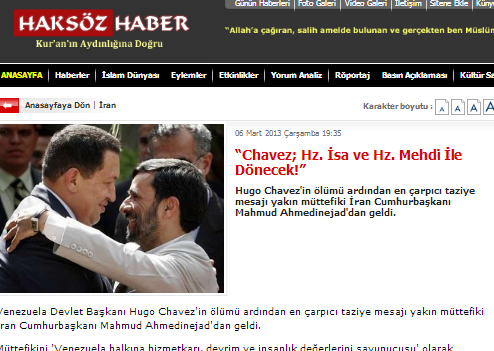 Bu yalan haber merkezlerinin verdiği habere göre Hugo Chavez’in vefaat haberi ile birlikte iran islam cumhuriyeti cumhur başkanı Mahmut Ahmedinejat, güya “Chavez; Hz. İsa ve Hz. Mehdi İle Dönecek.”demişti. Gerçeğin nasıl olsa açığa çıkacağını bilen ve bile bile yalan haber yazmaktan kaçınmayan bu Site ve kuruluşların tek amacı vardır ki o da ”çamur at tutmazssa izi kalır” mantığıdır.(Allah’ın laneti yalancıların üzerine olsun)